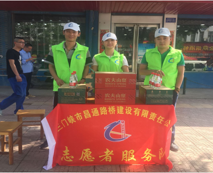 2016年6月7日烈日炎炎,三門峽市昌通路橋建設(shè)有限責(zé)任公司四名志愿者,在高考頭一天來(lái)到三門峽市一高考點(diǎn)為考生、考生家長(zhǎng)及嘔心瀝血的執(zhí)勤人員送去礦泉水,獻(xiàn)上一份愛(ài)心。